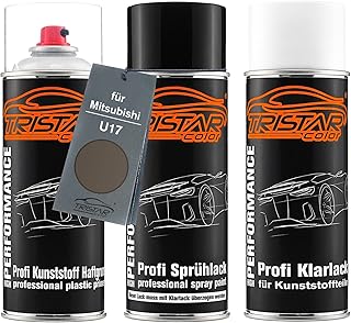 TRISTARcolor Autolack Spraydosen Set für Kunststoff Stoßstange für Mitsubishi U17 Titanium Grey Metallic/Mercury Gray Metallic Haftgrund Basislack Klarlack mit Weichmacher Sprühdose