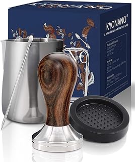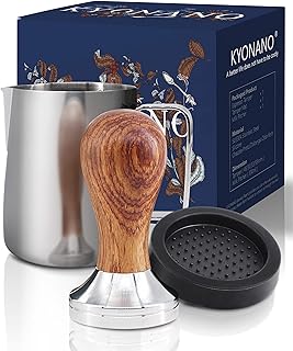 KYONANO Tamper 58 mm, Kaffee Tamper aus Hochwertigem Edelstahl und Chacate Pretoholzgriff, Espresso Tamper inkl. Tampermatte, Milchkännchen [350ml], Barista Stift, E-Books–Barista Set für Kaffeegenuss